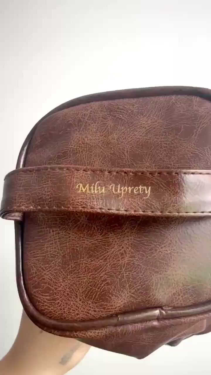 Spacious brown leather toiletry bag, classy and embossed with your personalized name whether it be an initial, short phrase, or full name! It fits all the necessary toiletries you want to travel with, and is sleek and smooth, perfectly fitting into your travel bag.